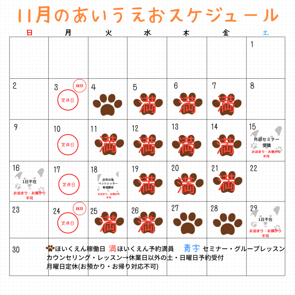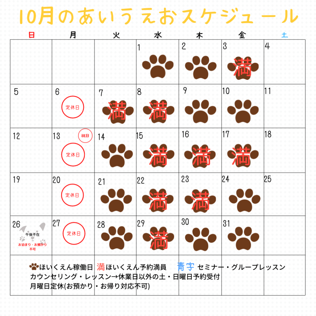※ほいくえんが満員の日は、日帰り預かりも満員です。お泊まりはお時間によってはお受けできる場合がありますので、🈵とついている日でもお問合せください。
