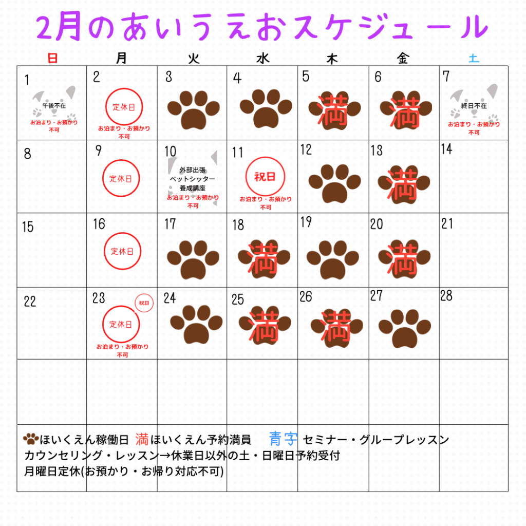 ※ほいくえんが満員の日は、日帰り預かりも満員です。お泊まりはお時間によってはお受けできる場合がありますので、🈵とついている日でもお問合せください。